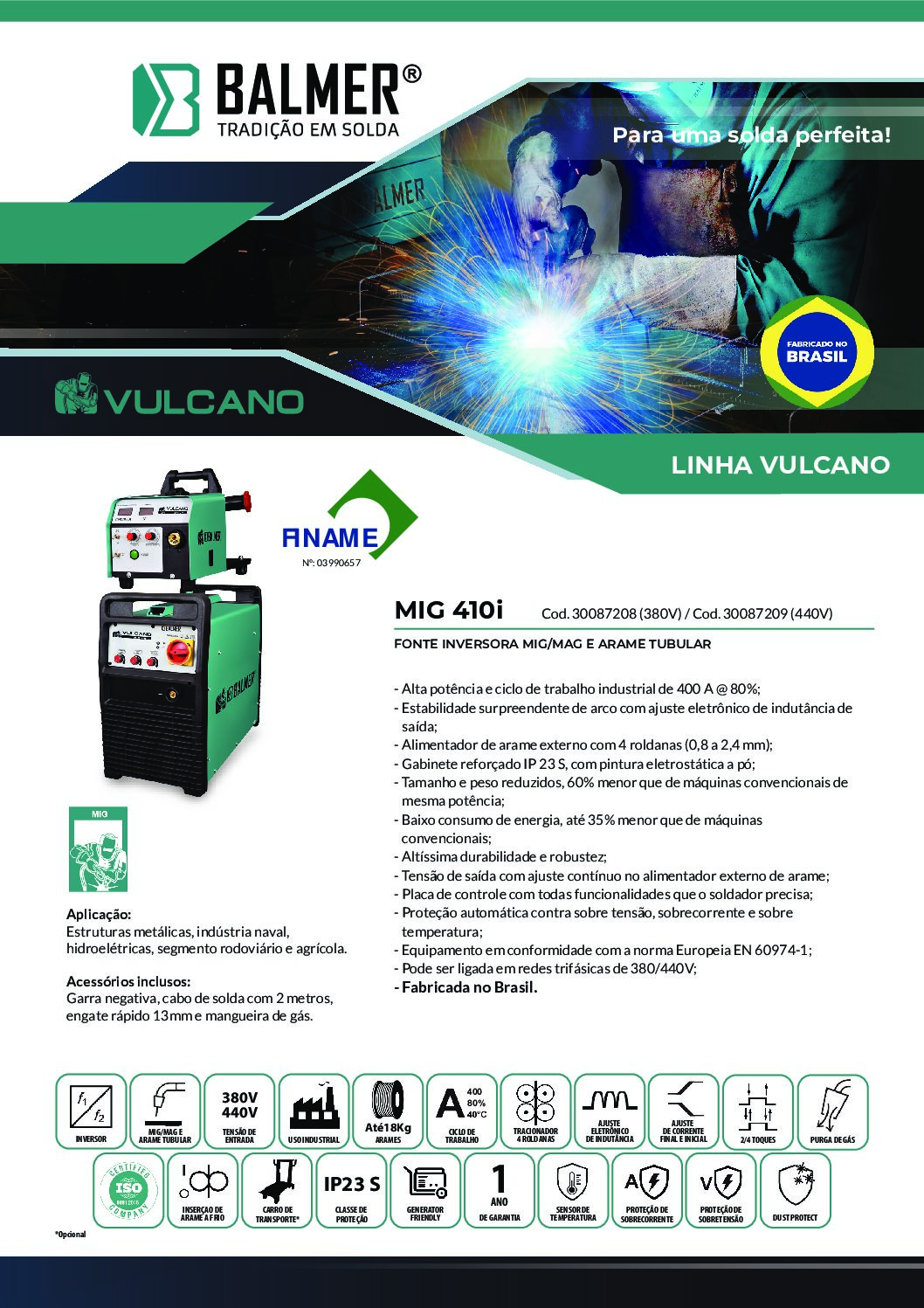 A fonte de soldagem MIG-MAG, modelo Vulcano MIG 410i adota a última tecnologia em modulação por largura de pulso e módulos de potência IGBT. Por isso, tem boa capacidade de controle e resposta dinâmica rápida, o que é conveniente para obter uma ótima estabilidade de solda e uma melhor transferência de metal em curto circuito.
