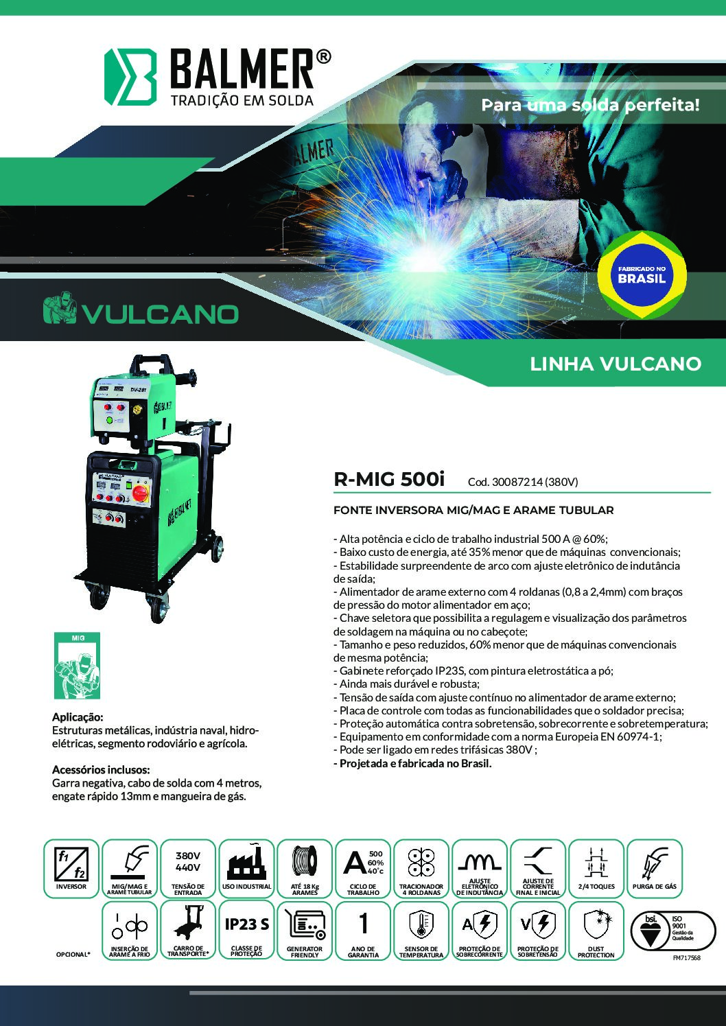 A fonte de soldagem MIG-MAG, modelo Vulcano MIG 500i adota a última tecnologia em modulação por largura de pulso e módulos de potência IGBT. Por isso, tem boa capacidade de controle e resposta dinâmica rápida, o que é conveniente para obter uma ótima estabilidade de solda e uma melhor transferência de metal em curto circuito.