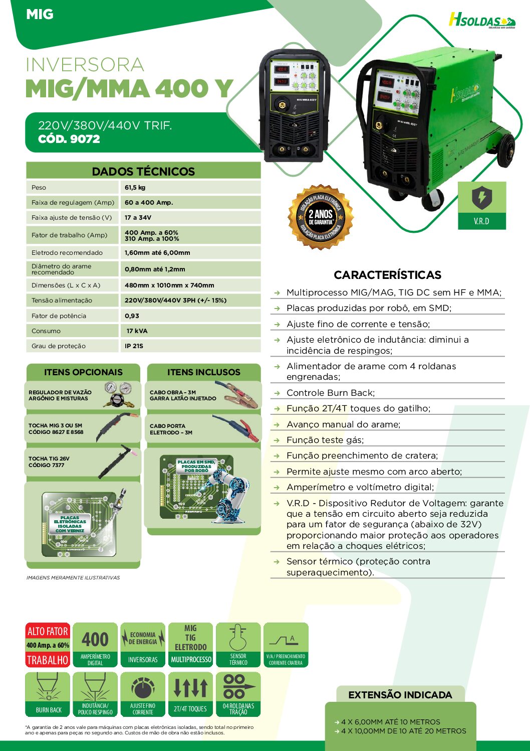 V.R.D – Dispositivo Redutor de Voltagem: garante que a tensão em circuito aberto seja reduzida para um fator de segurança (abaixo de 32V) proporcionando maior proteção aos operadores em relação a choques elétricos;