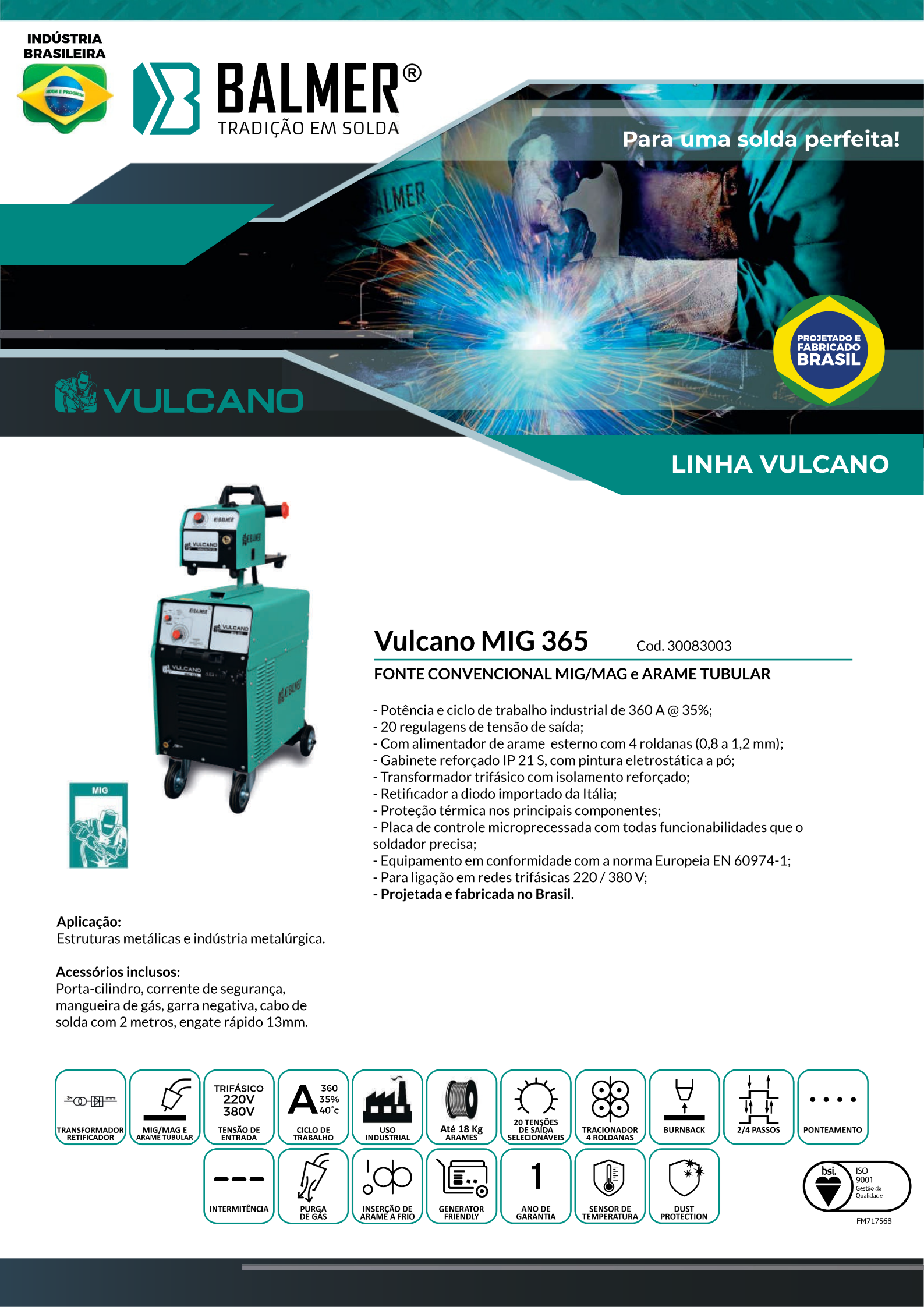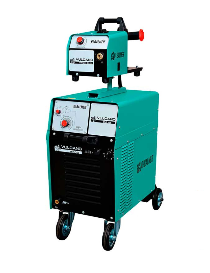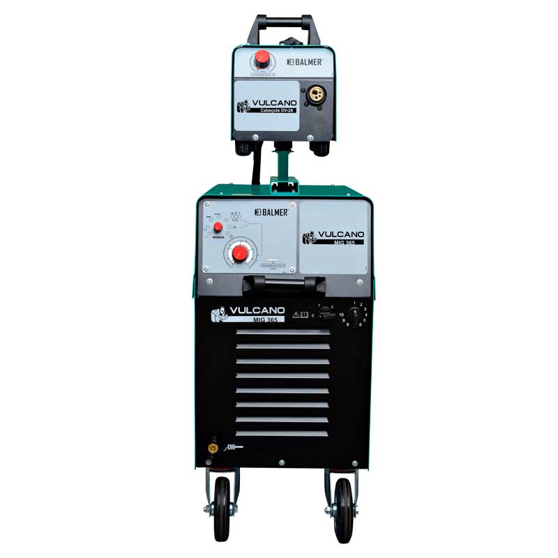 As fontes de soldagem MIG/MAG, da linha modelo Vulcano MIG proporcionam uma excelente estabilidade do arco elétrico em todas as faixas de soldagem com regulagem por comutador de múltiplas faixas (20 posições) que permite o ajuste preciso dos parâmetros, conta ainda com indutância de dois níveis (360A@35%), possui conjunto tracionador com roletes reforçados, controle linear exato de velocidade com sistema de freio eletrônico do motor e compartimento do rolo de arame.