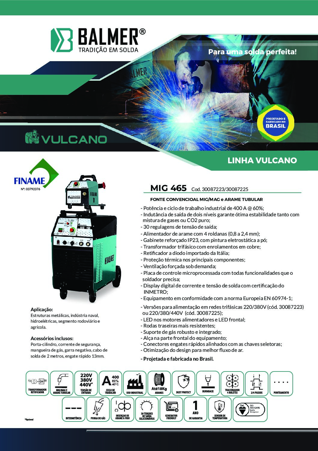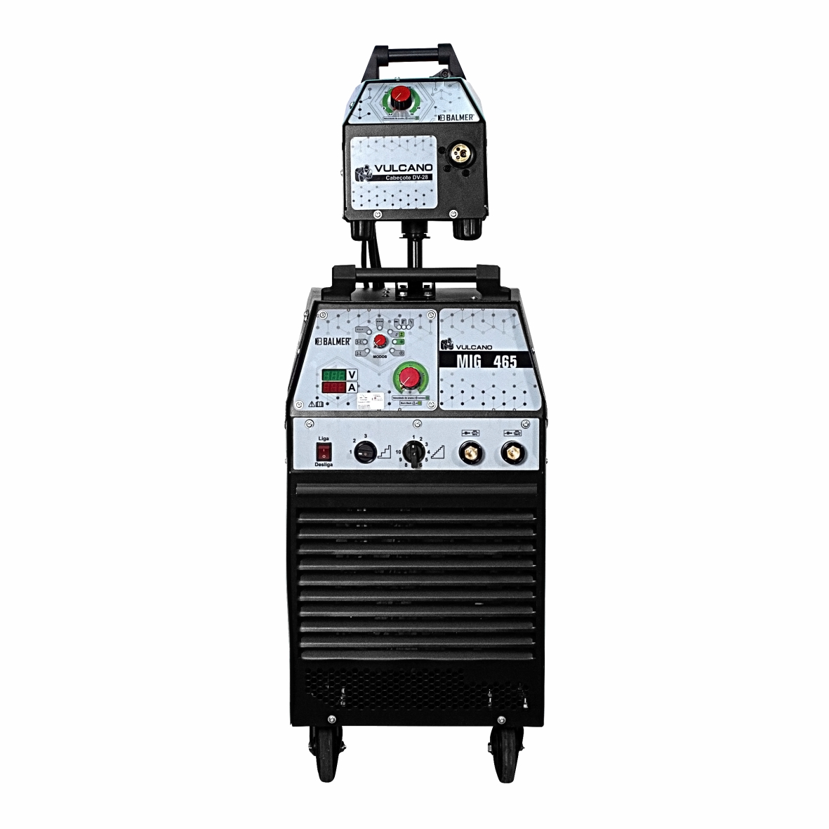As fontes de soldagem MIG/MAG, da linha modelo Vulcano MIG proporcionam uma excelente estabilidade do arco elétrico em todas as faixas de soldagem com regulagem por comutador de múltiplas faixas (30 posições) que permite o ajuste preciso dos parâmetros, conta ainda com indutância de dois níveis (400A @ 60% e 300A @ 100%), possui conjunto tracionador com roletes reforçados, controle linear exato de velocidade com sistema de freio eletrônico do motor e compartimento do rolo de arame.